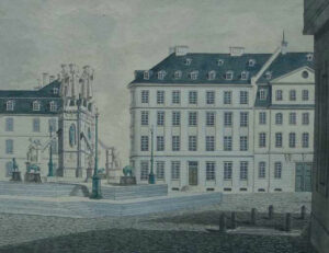 Städels Haus wird am rechten Bildrand zur Hälfte angeschnitten: Der Rossmarkt mit dem geplanten Gutenberg-Denkmal (Detail), 1840, Historisches Museum Frankfurt