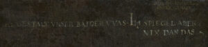 In der gebogenen Fläche erscheinen nämlich nicht die Gesichter der beiden Porträtierten, die bildlogisch im Profil wiedergegeben sein müssten, sondern – als würde der Spiegel einen Blick in die Zukunft offenbaren – zwei Totenschädel. Die offensichtlich von diesem Anblick ernüchterten Eheleute involvieren uns in diesen Dialog mit dem Tod, indem sie ihren Blick von ihrem zukünftigen Antlitz abgewandt haben, und uns auffordernd entgegenblicken. Dem wird durch die im Hintergrund zu lesenden Worte Nachdruck verliehen: „[SOLL]CHE GESTALT UNSER BAIDER WAS. IM SPIEGEL ABER NIX DAN DAS“. Will heißen: So sahen wir aus – so werden wir aussehen. Und das gilt auch für euch!