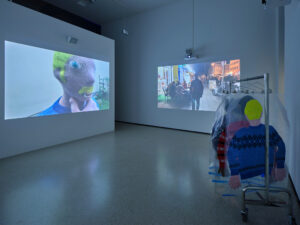 Die Videoinstallation Camouflage Pullover von 2018 bezieht sich auf eine Arbeit von 1992, den Tarnpullovern für Ausländer, die damals unter den rassistischen Ausschreitungen in Rostock -Lichtenhagen entstand. In der Videoarbeit von 2018 tragen Freunde von dir Strickpullover mit angenähten Masken, die rassistisch-stereotype Gesichter zeigen und damit durch Berlin ziehen. Den Passanten bleibt verborgen, wer wirklich hinter der Maske steckt. Was veranlasste dich dazu, die Arbeit von 1992 dann 25 Jahre später wieder aufzugreifen?