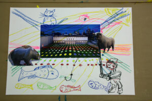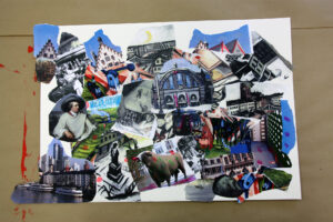 Zum Abschluss des Termins werden alle Collagen an die Wand gehängt, noch einmal in der Gruppe betrachtet und kurz kommentiert. Die Frau, die in Begleitung ihrer Nachbarin gekommen ist und während der Führung eher zurückhaltend war, äußert mit einem Lächeln: „Man ist wieder wie ein Kind.“ Sie war früher selbst Grafikdesignerin. Ihre Nachbarin berichtet, wie sie sich von ihr inspiriert gefühlt habe, selbst mutiger in der Gestaltung zu werden, Ausschnitte auch mal schräg aufzukleben und über die Begrenzung des Blattes hinaus zu arbeiten.