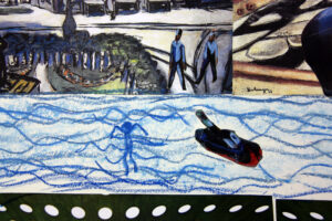 Auch die Kunstvermittlerin hat gemeinsam mit dem FSJler, der den Termin begleitet, eine Collage angefertigt. Mit blauem Wachsmalstift ist dort unter anderem eine Fläche mit einem Wellenmuster versehen, in deren Mitte eine zarte Figur eingezeichnet wurde. „Da habe ich an Sie gedacht: Das sind Sie, die über den Main schwimmt“, erklärt die Vermittlerin. „Das will ich wieder machen“, kommt prompt die Antwort der „Main-Überquererin“. Beim nächsten ARTEMIS-Termin sind sie und ihr Mann auf jeden Fall wieder dabei.