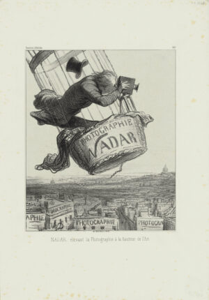 Der Künstler hatte die Fähigkeit, Personen treffsicher zu charakterisieren und gekonnt mit der Überzeichnung zu spielen. Ein gutes Beispiel hierfür ist unser Kampagnenmotiv. Es zeigt den Fotografen Nadar als kühnen Jongleur der Lüfte. Er schwebt mit seinem Heißluftballon über der Stadt. Der Wind hat ihm den Hut vom Kopf geweht, sein langer schlanker Körper passt nur mit Mühe in das Luftschiff, das bereits in bedenkliche Schieflage geraten ist – es ist ein waghalsiges Unterfangen. In Art einer Werbeanzeige verkündet der Ballon den Namen des Fotografen, dessen Metier die ganze Stadt erobert; ein „Photographopolis“, ganz so, wie es sich Nadar selbst erträumte. Der Fotograf lässt seinen Blick nicht einfach über die Stadt gleiten, sondern richtet ihn durch den Sucher der Kamera.