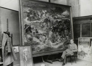 Oliver Baker, Max Beckmann in seinem Atelier vor dem Gemälde, Untergang der Titanic, 1912, Fotografie, Germanisches Nationalmuseum Nürnberg