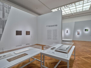 Blick in den Ausstellungsraum „Monumentale Aufgaben“, in den Tischvitrinen die Entwürfe Hans Mettels