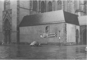 Blick auf Hans Mettels Relief des Heiligen Bartholomäus und des König Astyages, 1955/56, Dom, Frankfurt am Main, Fotografie, Städel-Archiv, Frankfurt am Main